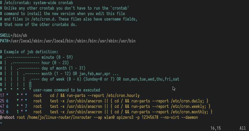 @reboot root /home/do/linux-router/lnxrouter --ap wlan0 OPIWIFI -p OPIPASS1 --no-virt --daemon