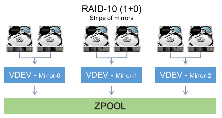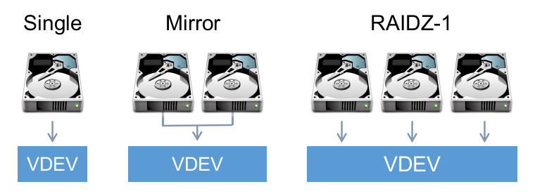 Một vdev bao gồm một hoặc nhiều ổ đĩa vật lý (cũng có thể là những thứ khác ngoài ổ cứng, như tệp). Chúng có thể được kết hợp với nhau trong máy nhân bản hoặc RAIDZ.