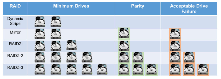 - RAIDZ-1 (RAID5) - Phân phối tính chẵn lẻ cùng với dữ liệu và có thể mất một ổ đĩa vật lý trước khi xảy ra đột kích. RAIDZ yêu cầu ít nhất 3 đĩa