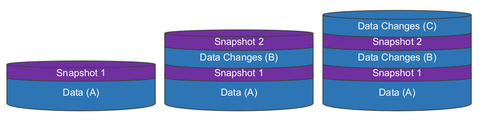Chúng ta hãy xem hình ảnh dưới đây làm ví dụ. Bạn có một hệ thống tệp với dữ liệu hiện có (Dữ liệu A) và bạn snapshot (Snapshot 1). Sau đó, bạn thực hiện một số thay đổi, thêm tệp mới (Dữ liệu B) và chụp một snapshot khác (Snapshot 2). Sau đó, bạn thực hiện nhiều thay đổi hơn nữa (Dữ liệu C).