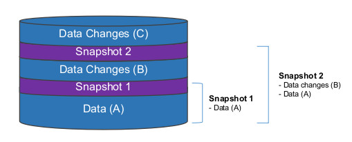 Snapshot 1 bảo vệ dữ liệu gốc (Dữ liệu A), trong khi Snapshot 2 bảo vệ Thay đổi dữ liệu (B) cũng như dữ liệu gốc (Dữ liệu A). Như vậy bạn có thể xóa snapshot 1 mà dữ liệu (A) vẫn sẽ được bảo vệ.